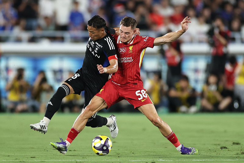 7月30日,利物浦队球员维尔茨(右)与横滨水手队球员喜田拓也在比赛中拼抢。\n 当日,在日本横滨举行的友谊赛中,英超利物浦队3比1战胜日本J联赛横滨水手队。\n 新华社记者 贾浩成 摄