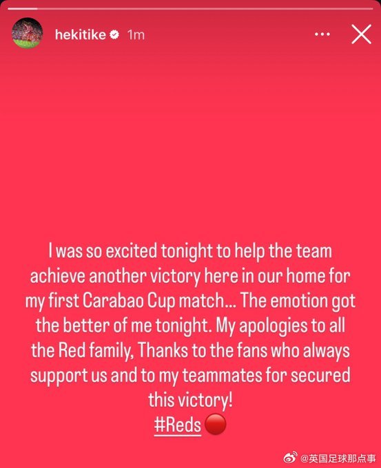 不过,赢球之后,埃基蒂克这张毫无必要的红牌,让全队将士有些不满。赛后,埃基蒂克在社媒向利物浦球迷道歉:" 今晚能首次参加联赛杯主场赛事并帮助球队再夺胜利,我无比激动!但今夜情绪确实有些失控。在此向所有红军大家庭致歉,也感谢一直支持我们的球迷,以及携手赢下比赛的队友们!”