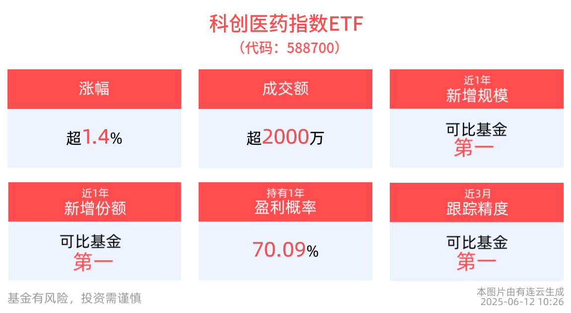 截至2025年6月12日 10:26,上证科创板生物医药指数上涨0.78%,成分股悦康药业上涨8.06%,百济神州上涨4.78%,泽璟制药上涨2.31%,博瑞医药上涨1.74%,神州细胞上涨1.56%。科创医药指数ETF(588700)上涨1.44%。