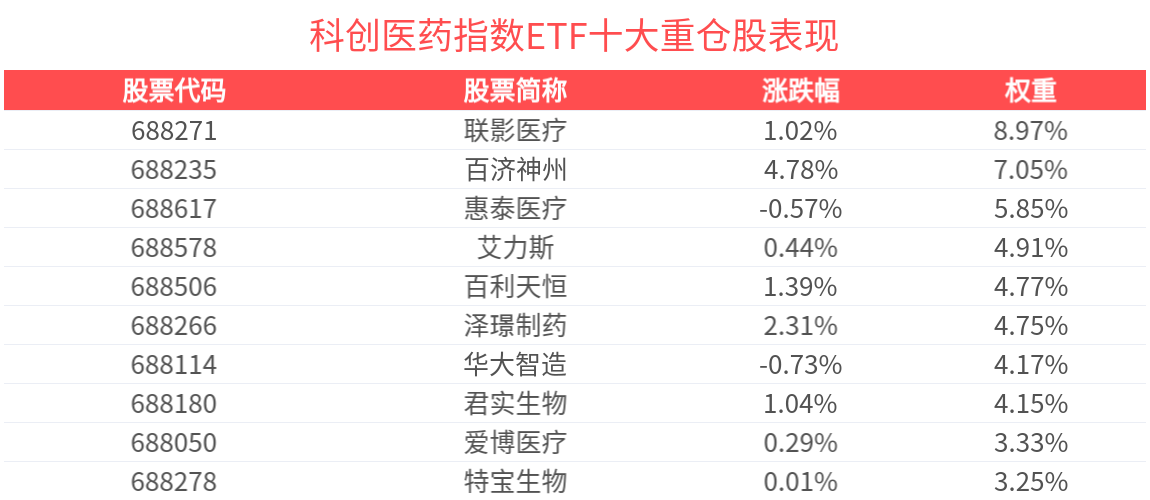 数据显示涨中宝,截至2025年5月30日,上证科创板生物医药指数前十大权重股分别为联影医疗、百济神州、百利天恒、惠泰医疗、艾力斯、泽璟制药、君实生物、博瑞医药、华大智造、特宝生物,前十大权重股合计占比51.6%。