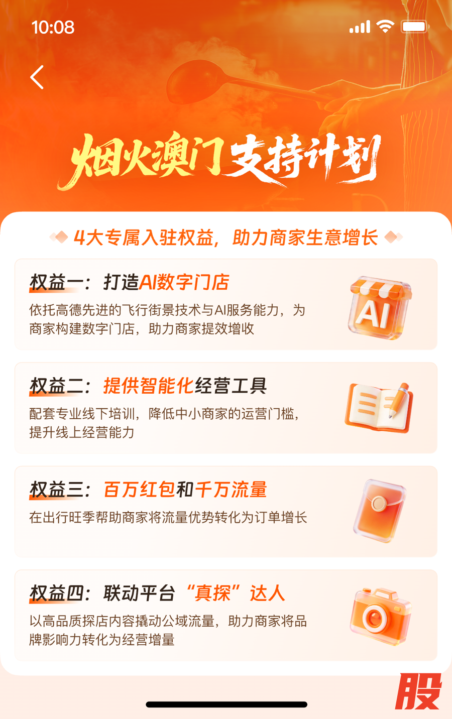 为帮助商家更好地承接大湾区融合带来的客流,高德联合澳门通推出“烟火澳门支持计划”,重点面向澳门知名品牌、老字号及品质小店,通过四大举措全面支持澳门线下商家发展:首先,打造"AI数字门店”,依托高德先进的飞行街景技术与AI服务能力,为商家构建数字门店,助力商家提效增收;其次,提供智能化经营工具,并配套专业线下培训,降低中小商家的运营门槛,提升线上经营能力;再次,投入百万红包和千万流量,在出行旺季帮助商家将流量优势转化为订单增长;最后,联动平台“真探”达人,以高品质探店内容撬动公域流量,助力商家将品牌影响力转化为经营增量。